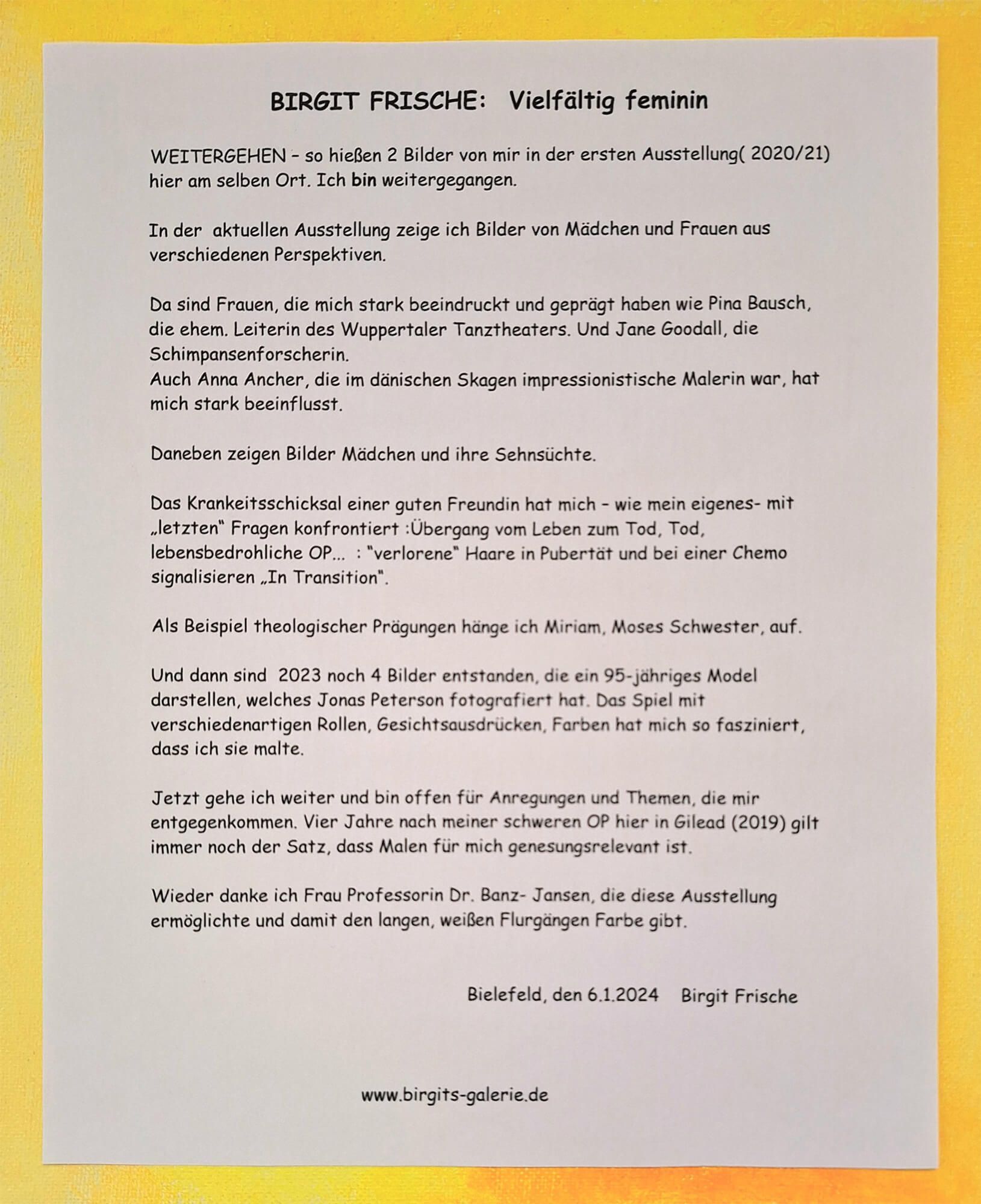 „Als ich wegen einer schweren onkologischen Erkrankung 2019 in der Klinik von Frau Professorin Banz-Jansen lag, hat mich die Malerei in meinem langen Gesundungsprozess unterstützt. Ich machte mir in Kraftpausen selbst Mut zum Weitergehen, indem ich mit Pinsel und Leinwand arbeitete.“ Kunst ist für Birgit Frische genesungsrelevant. Neben den Bildern die Frauengesichter zeigen, gibt es noch eine Reihe an Kinderporträts, von deren Sensibilität im Ausdruck die Malerin besonders fasziniert ist. „Dabei mag ich vor allem die Fröhlichkeit und Buntheit der Motive. Diese Atmosphäre, die die Gesichter ausstrahlen, baut auf.“