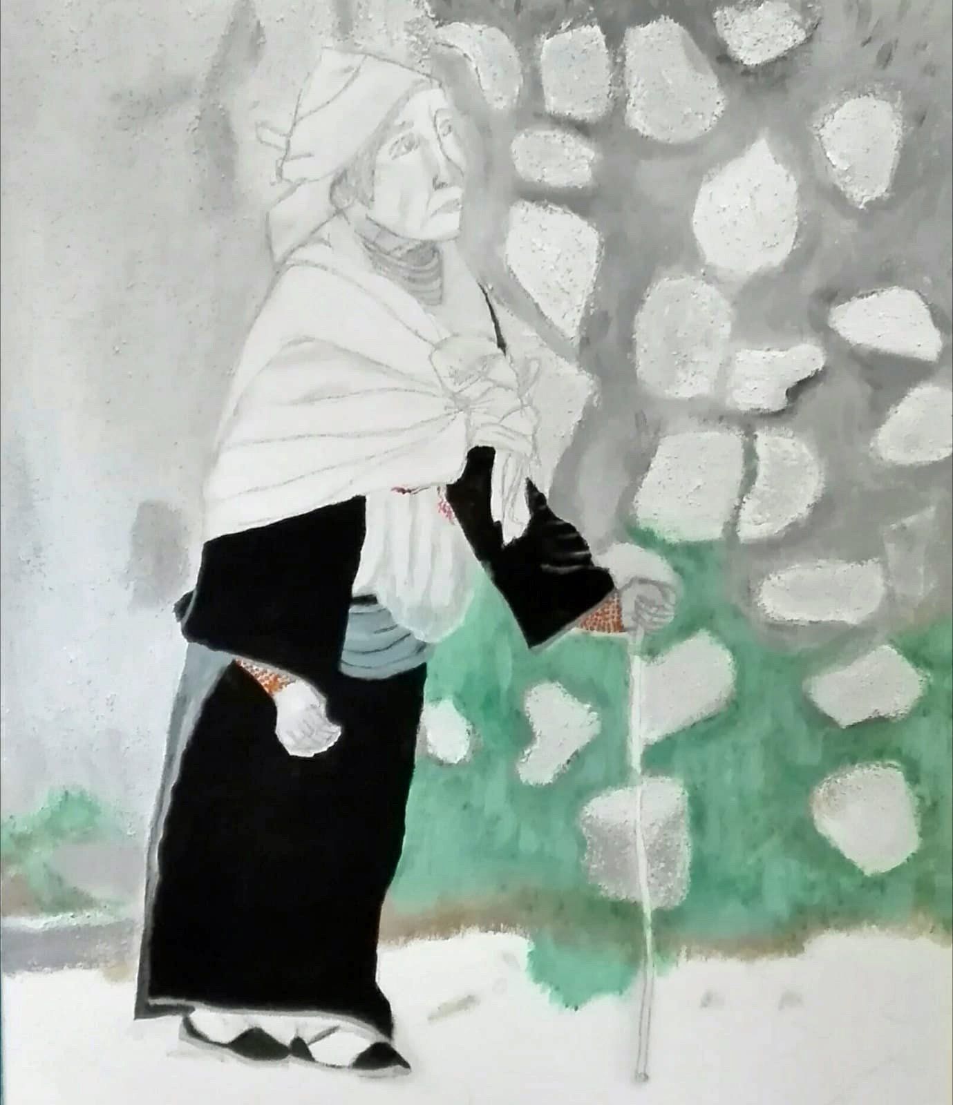 Es entstehen Details. An manchen Stellen (z.B. an dem Fuß/dem Schuh der FRAU VOR DEM HAUS-Nepal) arbeite ich durchaus auch mal 1 ½ Stunden, bis er wirklich der Vorlage entspricht.